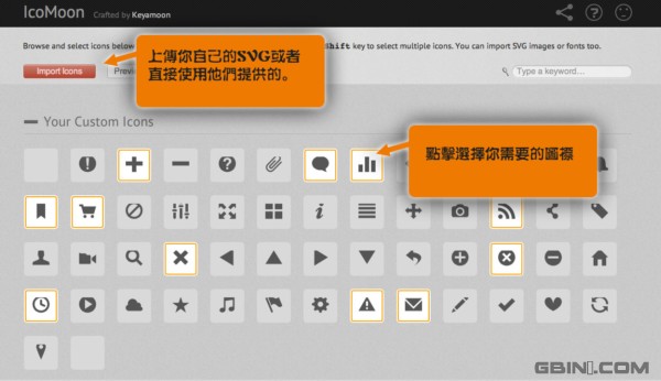 如果大家需要?jiǎng)?chuàng)建自己的iconfont,推薦使用iconmoon,使用它你可以通過(guò)上傳SVG或者字體來(lái)生成你需要的icon字體,本文在線演示使用iconmoon生成。