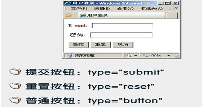 按鈕主要有三種:提交按鈕,重置按鈕和普通按鈕