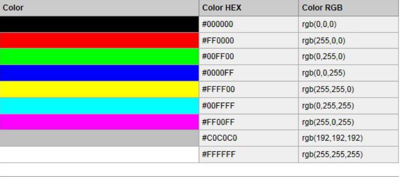 僅僅有 16 種顏色名被 W3C 的 HTML4.0 標準所支持。它們是:aqua(淺綠色), black(黑色), blue(藍色), fuchsia(紫紅色), gray(灰色), green(綠色), lime(綠黃色), maroon(褐紅色), navy(深藍色), olive(橄欖色), purple(紫色), red(紅色), silver(銀色), teal(青色), white(白色), yellow(黃色)。如果需要使用其它的顏色,需要使用十六進制的顏色值。