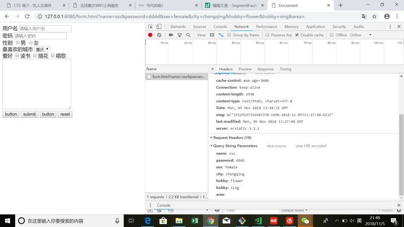 <!DOCTYPE html><html lang="en"><head> <meta charset="UTF-8"> <meta name="viewport" content="width=device-width, initial-scale=1.0"> <meta http-equiv="X-UA-Compatible" content="ie=edge"> <title>Document</title></head><body><form action="/form.html" method="GET"> <!-- action: 表單提交的地址 --> <!-- method:提交保單的方法 --><div class="name"> <label for="name">用戶名</label> <input type="text" name="name" id="name" placeholder="請輸入用戶名"> <!-- placeholder是透明的提示文字 --></div><div class="password"> <label for="password">密碼</label> <input type="password" name="password" id="password" placeholder="請輸入密碼"></div><div class="sex"> <label for="sex">性別</label> <input type="radio" name="sex" value="male">男 <input type="radio" name="sex" value="female">女</div><div class="city"> <label for="city">最喜歡的城市</label> <select name="city" id="city"> <option value="beijing">北京</option> <option value="shanghai">上海</option> <option value="chongqing" selected >重慶</option> <!-- selected 表示被選中在頁面展示的選項 --> </select></div><div class="hobby"> <label for="hobby">愛好</label> <input type="checkbox" name="hobby" value="read">讀書 <input type="checkbox" name="hobby" value="flower">插花 <input type="checkbox" name="hobby" value="sing">唱歌 <!-- 所有選項name要一樣 --></div><div class="area"> <textarea id="area" name="area" cols="30" rows="10"></textarea></div><button>button</button><!-- 可以提交表單 --><input type="submit" value="submit"> <!-- 可以提交表單 --><input type="button" value="button"><!-- 不可以提交表單 --><input type="reset" value="reset"><!-- 對表單里面已經輸入的內容做重置 --></form></body></html>