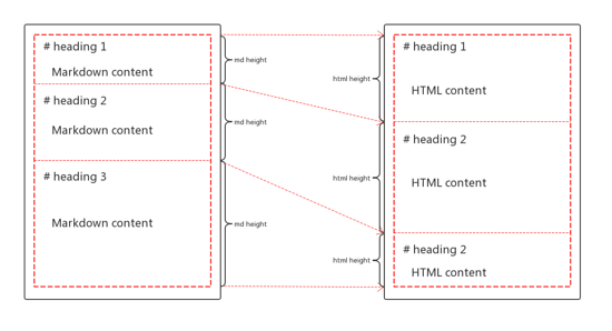 而標(biāo)題對(duì)齊要更加精確一些,它把編輯區(qū)和預(yù)覽區(qū)的高度換成了 標(biāo)題高度+標(biāo)題下內(nèi)容的高度 即 片段 的高度,然后根據(jù)當(dāng)前的片段對(duì)應(yīng)的高度計(jì)算滾動(dòng)距離。