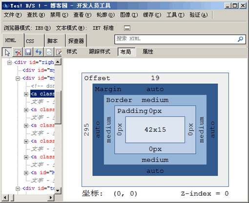 【布局】視圖可以顯示選中元素的盒裝模型信息。雖然相比FireBug可以顯示更多的信息,但是我還是比較喜歡FireBug中直接在頁面上用色塊表現出來的方式。