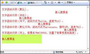 文字滾動示例(向上,背景色為#CCFF66,設置了背景寬度和高度):<marquee direction="up" bgcolor="#CCFF66" width="250" height="55">做人要厚道</marquee>