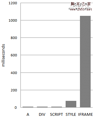 使用 iframe 可以輕易的調用其他網站的頁面,但應謹慎使用。它比創建其他 DOM 元素(包括 style 和 script)多耗費數十甚至數百倍的性能。增加100個不同元素的時間對比顯示 iframe 是多么耗費性能: