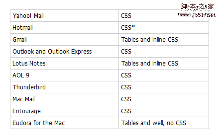 要讓所有用不同客戶端的用戶看到的郵件相同,這就要非常好的掌握好HTML的基本功。有人說DIV+CSS,有人說是SEO標(biāo)簽語義化,不可否認(rèn)作 為一個網(wǎng)頁開發(fā)人員,能有這兩種時下流行的HTML開發(fā)思想會很吃香,但是,這并不適用于郵件制作。我們的目的是讓客戶在不同郵件客戶端下看到相同的信息 內(nèi)容,這就用到一個最原始的排版方式:表格布局+CSS。讓我們看下時下郵件客戶端對HTML和CSS的支持(圖):