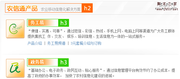 農信通產品首頁用到的H標簽,不僅有清晰的層級關系,而且突出了產品內容的重要性,對搜索引擎來說也非常有利。
