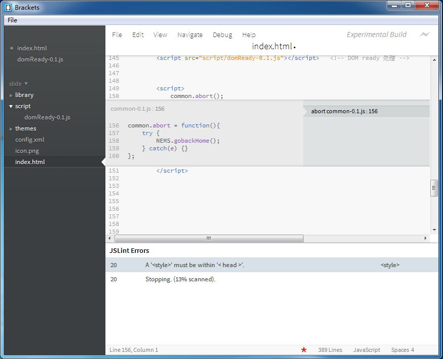 3、Brackets同樣支持對JS對象定義的快速預覽/編輯,把光標放在一個js函數名稱上,按下Ctrl/Cmd + E(“編輯”)或退出編輯。
