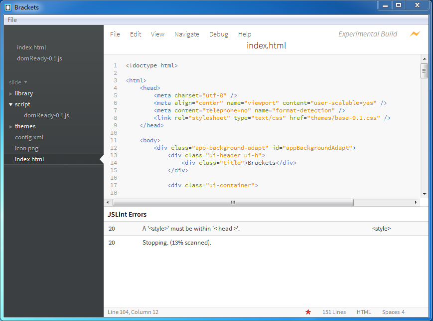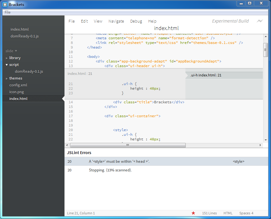 Brackets提供網頁即時預覽功能。使用該功能時,Brackets調用Chrome瀏覽器打開當前頁面,此后修改html、css、javascript并保存后,所修改的內容會即時響應到瀏覽器中的頁面,無須手動刷新頁面。這是Brackets最大的一個亮點,有兩個顯示器的coder有福了,可以分屏顯示Brackets和chrome,即時修改即時預覽,無需切換編輯器/瀏覽器和刷新頁面。