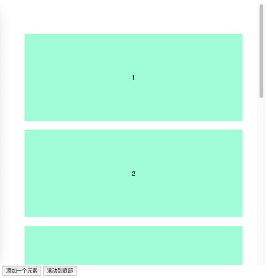 上面的代碼包含一個可滾動的區域,并可以為滾動區域添加元素,也可以滾動到指定的元素位置,大致效果如下圖。