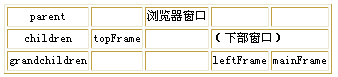 在這段代碼中,關鍵是代碼“parent.mainFrame”,這里引入一個新的概念―窗口結構關系,也就是在多窗口頁面中,各窗口之間的關系是以什么原則來確定的。窗口關系的確定原則是:當前窗口分割出來的窗口為當前窗口的“子窗口”(children),那么當前窗口就是分割出來窗口的“父窗口”(parent)。如本例中各窗口的關系如下: