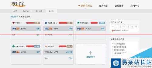 1、首先我們登錄支付寶首頁,選擇右邊的其他賬戶——銀行卡,進(jìn)入銀行卡管理頁面。