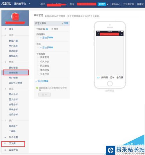 2、如果審核通過后就可以進入服務窗頁面,在這個界面可以添加菜單什么,如果所示