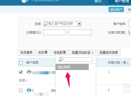 6、完成設(shè)置,下次這個買家就不能在自己店鋪買東西啦,如需要刪除,點擊這個禁止標簽進行刪除即可。