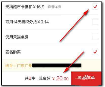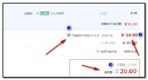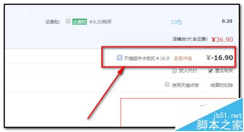 4、同步驟5的操作一樣,勾選“天貓超市卡抵扣16.9元”后,結算金額即變成20元;