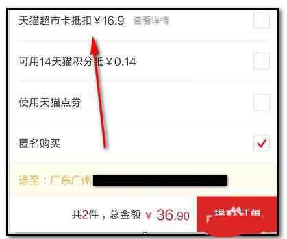 在“天貓超市卡抵扣16.9元”前面有一個小方框,在小方框里點下,即表示使用“天貓超市享淘卡”抵扣貨款16.9元;