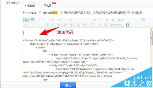7、詳情頁添加視頻的方法跟首頁類似,進入賣家中心——出售中的寶貝——編輯需要的寶貝(進入寶貝詳情編輯頁面),同樣的點擊第一個<>符號進入代碼模式,粘貼播放器代碼確認然后發布,打開寶貝就可以看到詳情頁里也有視頻了