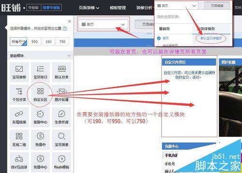 4、進入“店鋪裝修”頁面在左側拖動一個自定義欄到您所需要安裝播放器的位置。