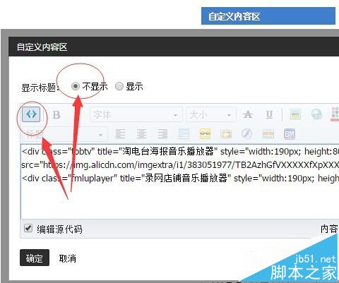 5、編輯剛添加的自定義欄,點擊不顯示標題,第一個<>符號進入代碼模式,粘貼播放器代碼確認然后發布,然后可進店查看,一個視頻就添加完成了。
