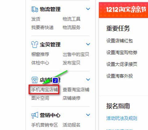 2、進(jìn)入賣家中心后,點(diǎn)擊左邊的”手機(jī)淘寶店鋪“!