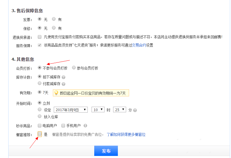 5、再移動到下方,內容框里面就寫運費專拍等信息。下面的選項,一般不加入櫥窗推薦,免得浪費廣告位。而且最好不要參與會員打折,否則老用戶拍下的時候,郵費也會有打折的情況。填好之后,我們就可以發布寶貝了。