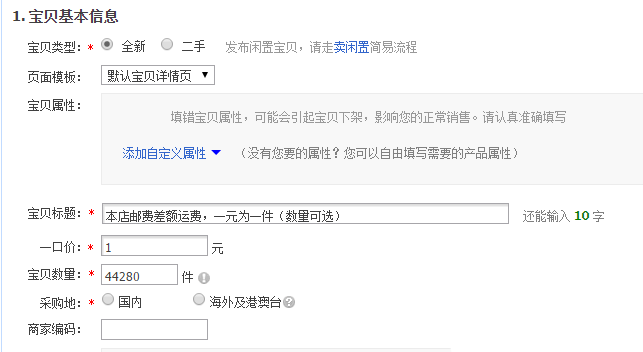 3、現在到達寶貝發布頁面,寶貝標題填寫為郵費差額運費的內容,這個可以隨意定義。價格一般填寫1元,這樣客戶只需選擇購買數量即可。10元的郵費就拍10個。