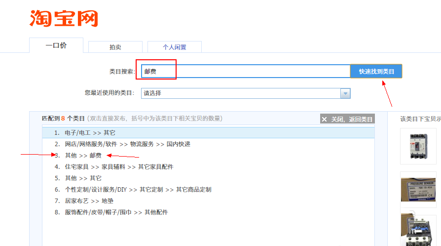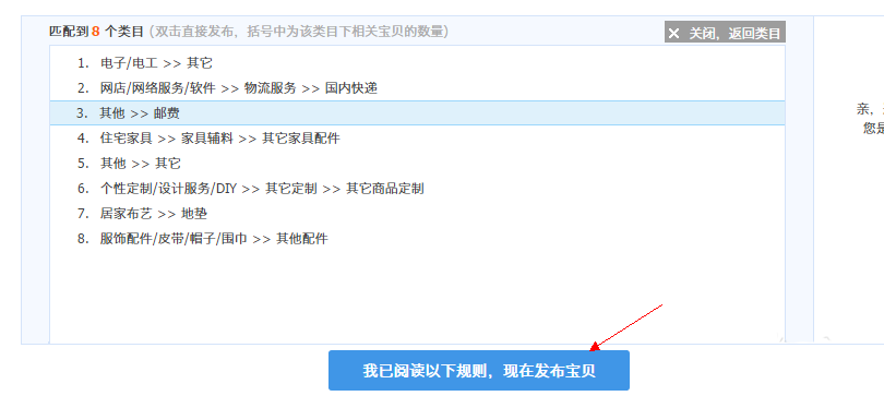 2、我們選擇類目的時候,可以直接搜索“郵費”,點擊旁邊的快速找到類目。然后下方就會出現幾個類目可選。此時,我們必須選擇“其他”類面的“郵費”。現在淘寶規定很嚴格,補拍郵費必須放在其他的類目下。選好之后,選下面的“我已閱讀以下規則,現在發布寶貝”。