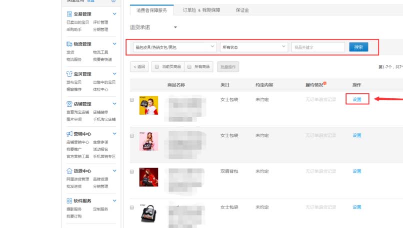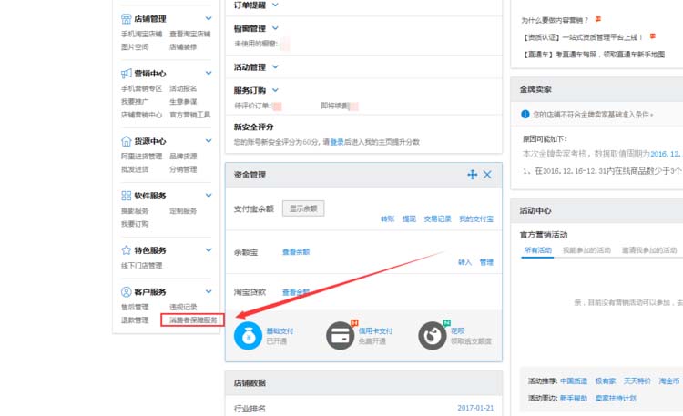 4、下面我們看下如何選定商品加入到"退貨承諾”服務,首先我們進入到賣家中心后臺,往下拉在左側最下面找到“客戶服務”-“消費者保障服務”。