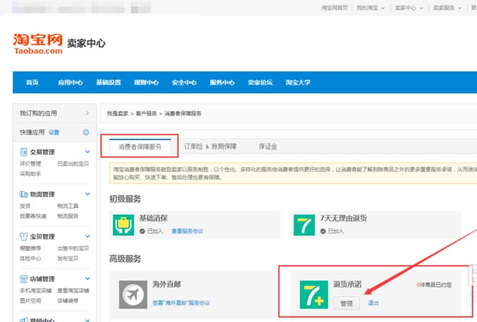 5、進入后選擇左上方的“消費者保障服務”就會看到管理圖標,我們點擊“管理”按鈕。