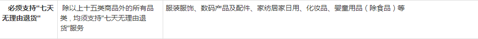 3、必須支持"七天無理由退貨",除以上十五類商品外的所有品類 , 均須支持"七天無理由退貨"服務。