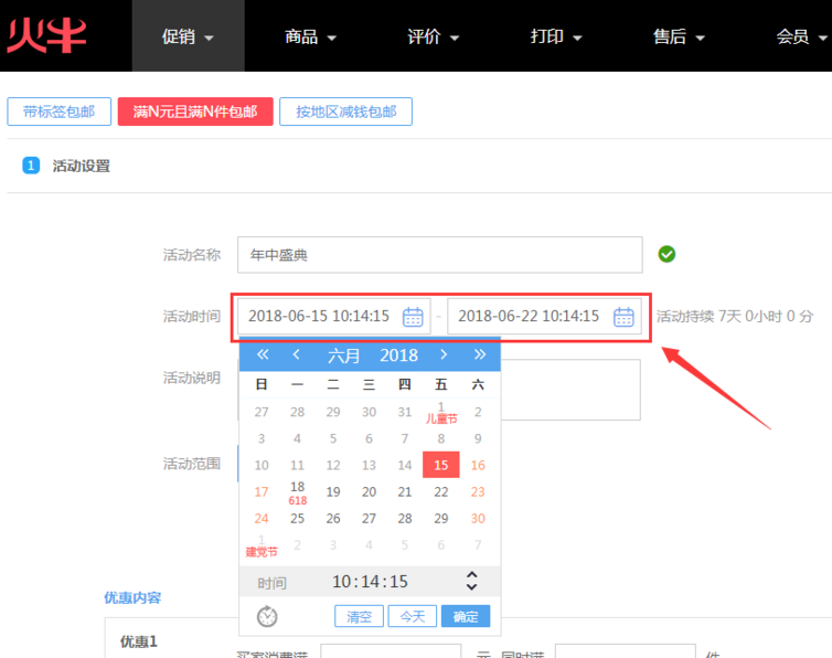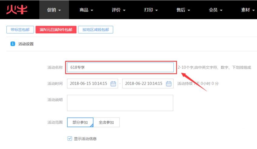 3、進入活動創建頁面后,首先輸入活動名稱,這個活動的名稱可以自定義,根據店鋪活動主題去設置。