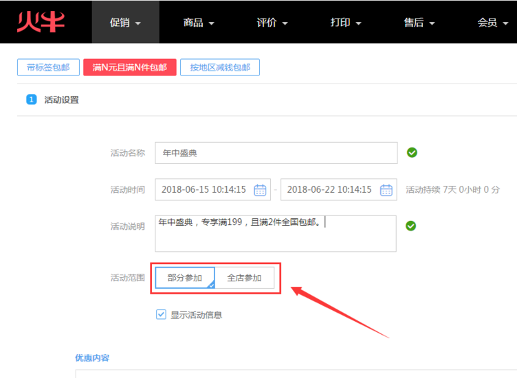6、選擇活動范圍,一般建議使用【部分參加】這樣方便管理低利潤的商品,不至于會虧本成交。