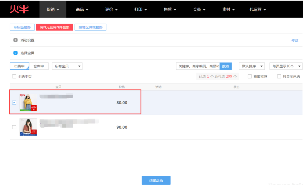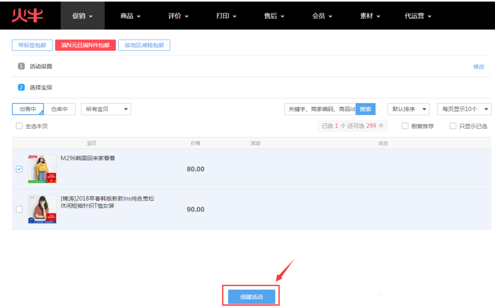 8、勾選需要參加活動的寶貝后,點擊頁面下方的【創建活動】按鈕,即可完成包郵活動的創建。