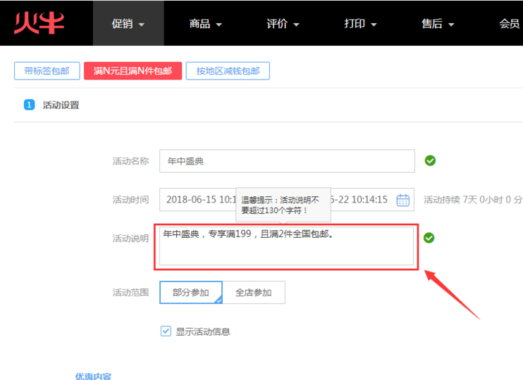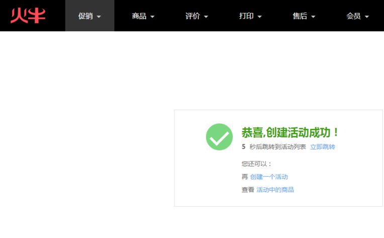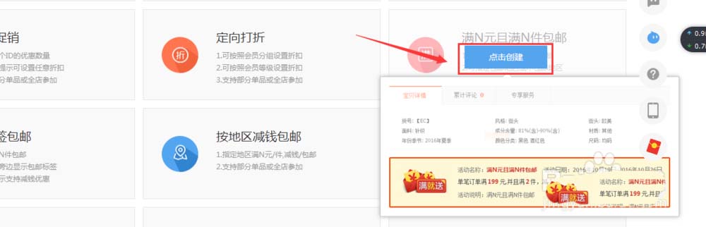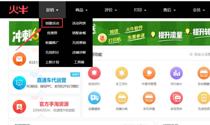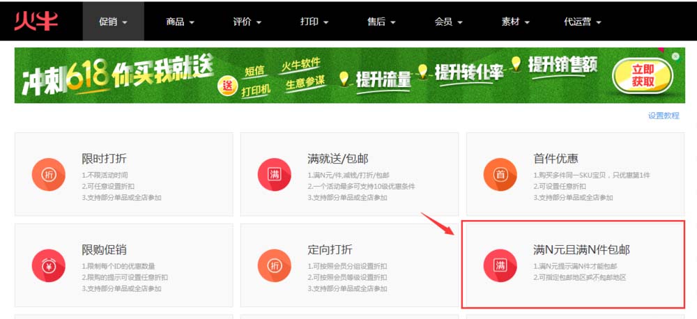 2、在火牛首頁導航欄的【促銷】里面找到【創建活動】按鈕,點擊進入創建活動頁面,找到【滿N元且滿N件包郵】的活動。鼠標經過改活動可以預覽預覽活動上線后的效果。點擊【創建活動】按鈕,即可進入活動設置頁面開始創建包郵活動。