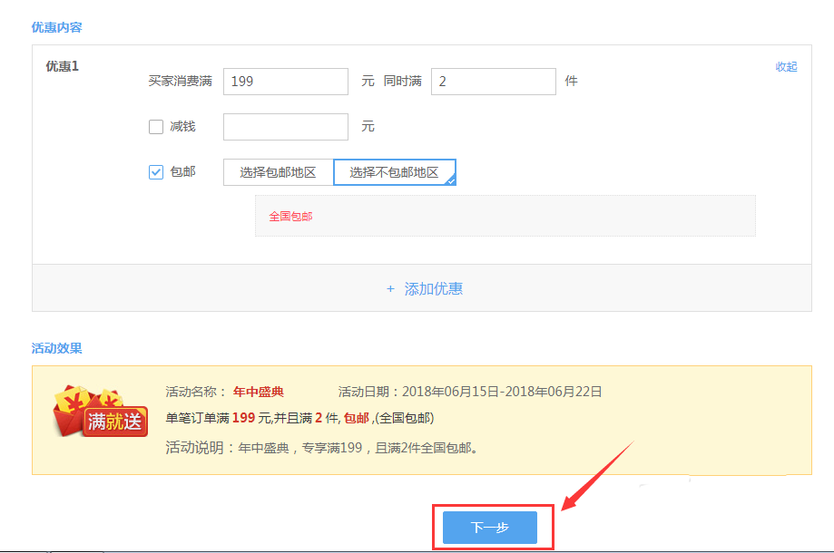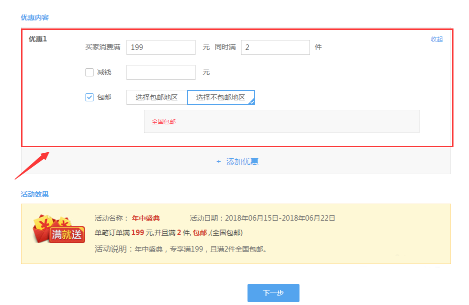7、設置活動優惠內容,這可以根據不同金額和件數去設置錯層優惠,以達到刺激用戶更多購買產品。在頁面下方,可以預覽活動banner圖片。檢查活動內容,確認無誤以后,點擊【下一步】去選擇活動商品。