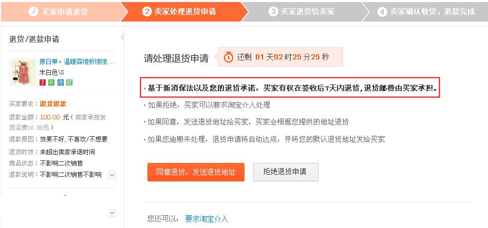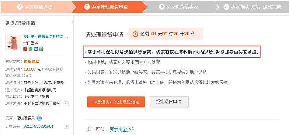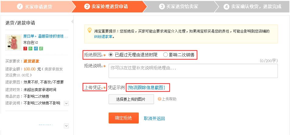 (注意:1、賣家拒絕必須選擇原因,且只允許這兩種原因才能拒絕,如果賣家有退貨承諾且允許影響二次銷售,則拒絕原因中影響二次銷售的選項不出現。2、老的7天無理由退貨是不允許拒絕的,本次允許拒絕,但需上傳憑證(必選),證實拒絕是合理的。)