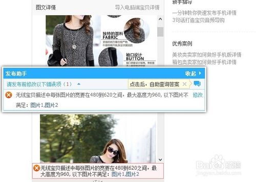 當手機端編輯的圖片寬度不在480-620,高度高于960時,保存以后會報錯。并將有錯的圖片以鏈接方式變色顯示出來,點擊可彈出錯誤的圖片。只要針對這張照片進行刪除、替換等修改就可以了。