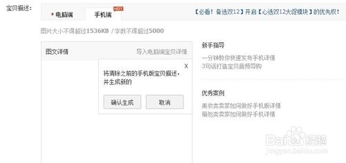 1.在發布寶貝里面,填寫電腦端后,緊接著下面就會有“生成手機版寶貝詳情”的快捷按鈕。點擊就能直接顯示手機端編輯窗口。自動將電腦端的圖文都轉化成手機端。非常方便。