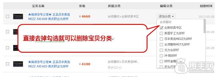 5、刪除寶貝分類和添加寶貝分類的操作相同,只要找到需要分類的寶貝點擊添加分類,將需要刪除的分類去掉勾選即可,如: