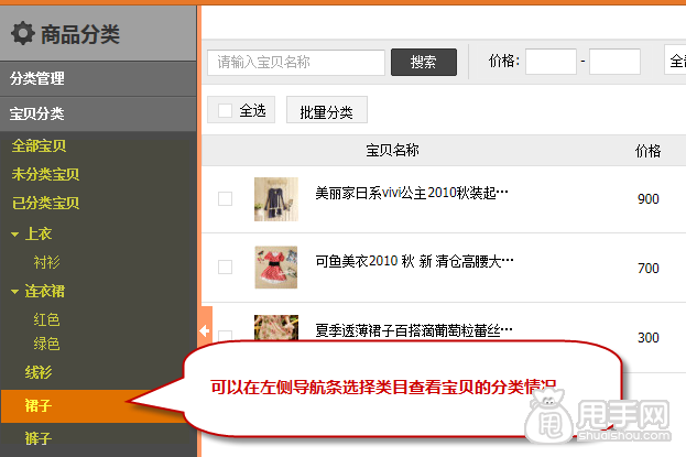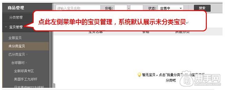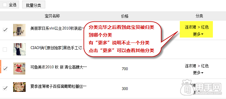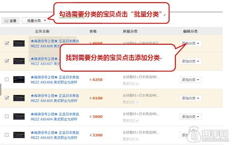 2、可對單個未分類的寶貝添加分類,也可進行“批量分類”的操作,如圖:
