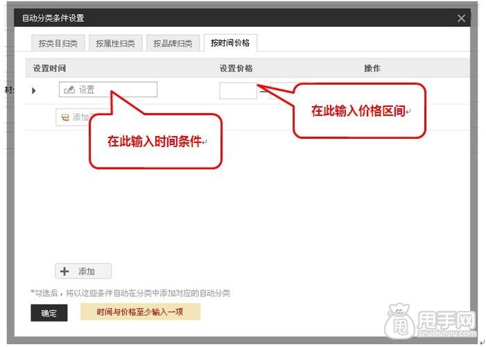 在設置按照時間價格分類的時候,時間和價格至少要輸入一樣,或者同時設置時間和價格條件