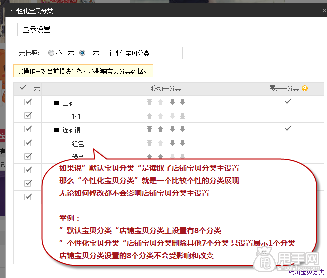 前面說過,新旺鋪的寶貝分類模式分有兩種展現形式,一種默認寶貝分類,另一種是個性化寶貝分類,而默認寶貝分類是讀取了剛才后臺設置的分類,其修改編輯和刪減都會影響到后臺寶貝分類的主設置。個性化寶貝分類則是讀取了剛才后臺設置的分類之后,修改編輯和刪減都不會影響到后臺寶貝分類的主設置。