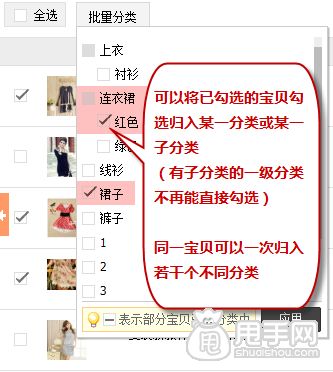 3、勾選好所需要分類的寶貝,并且將寶貝同時分到若干個不同的分類里,而已經有子分類的一級分類將無法進行直接勾選,寶貝必須要選擇其中的某個子分類進行勾選,如: