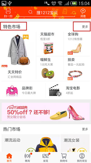 二、因為照顧了雙12,所以特色購物的一系列推下了,往下拉吧,找到特色市場,點擊更多