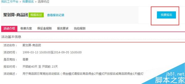 在“活動詳情”中你還可以了解到:活動的介紹、收費的方案、報名要求、坑位規則以及保證金規劃等,同時要點擊“我要報名”進行報名: