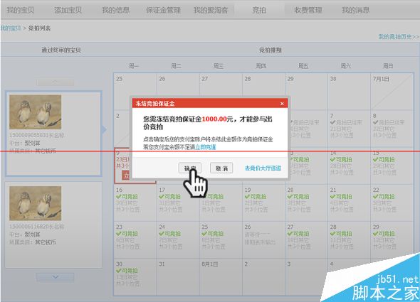 b、點擊競拍日期的時候會彈出先凍結競拍保證金的窗口,賣家確認凍結之后才能正式參與競拍