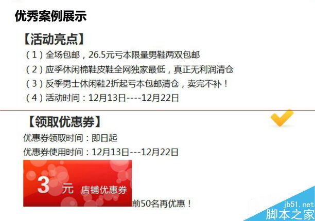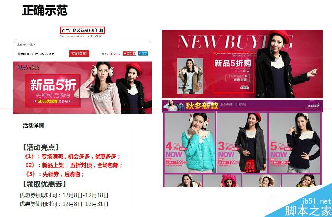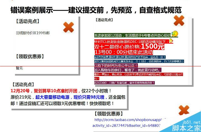 e、活動(dòng)詳情的描述內(nèi)容,必須要和活動(dòng)頁(yè)所體現(xiàn)的主題、折扣優(yōu)惠力度要素要保持一致。