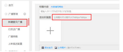 注意要從“新建圖文廣播”進入編輯,提醒22個漢字或者字母,尺寸680*680。