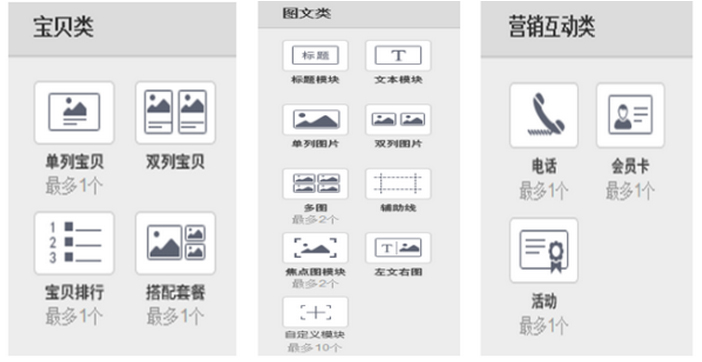 進入后,拖動鼠標直接把要裝修的框架通過鼠標拖到首頁中間位置即可,分為:寶貝頁,圖文頁,營銷互動類。