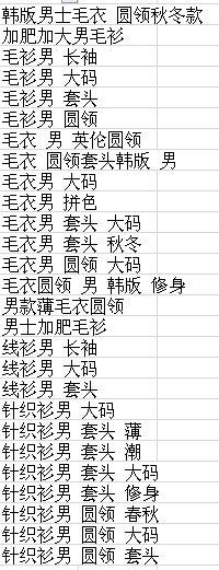 從上圖表中可看出,出現(xiàn)頻率比較高的詞有“針織衫難”、“大碼”、“套頭”、“毛衣男”等,所以,我們就可以用針織衫男 套頭等這些詞在淘詞里面去找衍生詞。