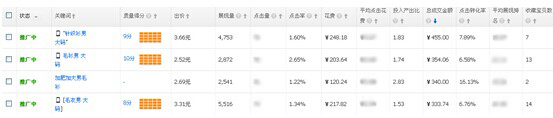 由于我推廣的是整體,基本上都是零銷量的店鋪產(chǎn)品,所以在加詞的時(shí)候,是從長尾詞開始加的,然后是中性詞,泛詞我先不加,但如果一定要加的話可以先出低價(jià),或者精準(zhǔn)匹配之后再低價(jià),主要還是看關(guān)鍵詞的點(diǎn)擊率,另外,加的詞一定要考慮整體的情況,例如男裝,長尾詞可以精準(zhǔn)引流,但是男裝的長尾詞出價(jià)明顯偏高,而且長尾詞的展現(xiàn)量比較小,如果整體點(diǎn)擊情況不好的話,就會導(dǎo)致質(zhì)量分下降,使得展現(xiàn)量就更少了,這樣的話,即是出再高的價(jià)格也很難獲取到流量。